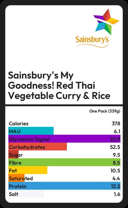 Sainsbury's My Goodness! Red Thai Vegetable Curry & Rice contains 379.7 calories in one Pack (339g).