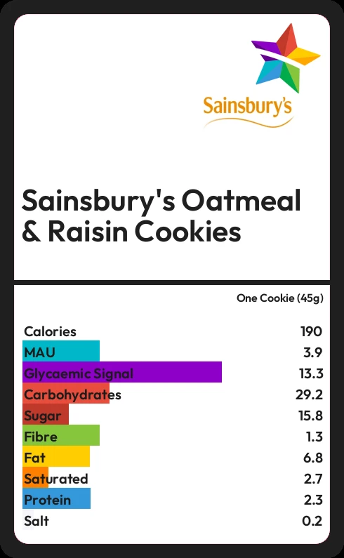 Sainsbury's Oatmeal & Raisin Cookies contains 15.8g sugar in one Cookie (45g) - that is around 4 cubes of sugar.