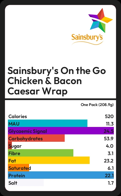 Sainsbury's On the Go Chicken & Bacon Caesar Wrap contains 520.2 calories in one Pack (208.9g).