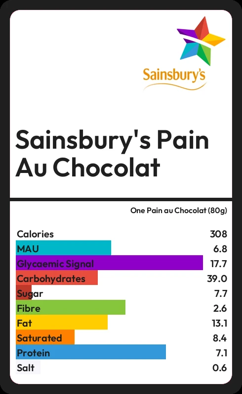 Sainsbury's Pain Au Chocolat contains 308 calories in one Pain au Chocolat (80g).