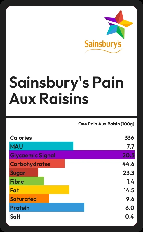 Sainsbury's Pain Aux Raisins contains 23.3g sugar in one Pain Aux Raisin (100g) - that is around 6 cubes of sugar.