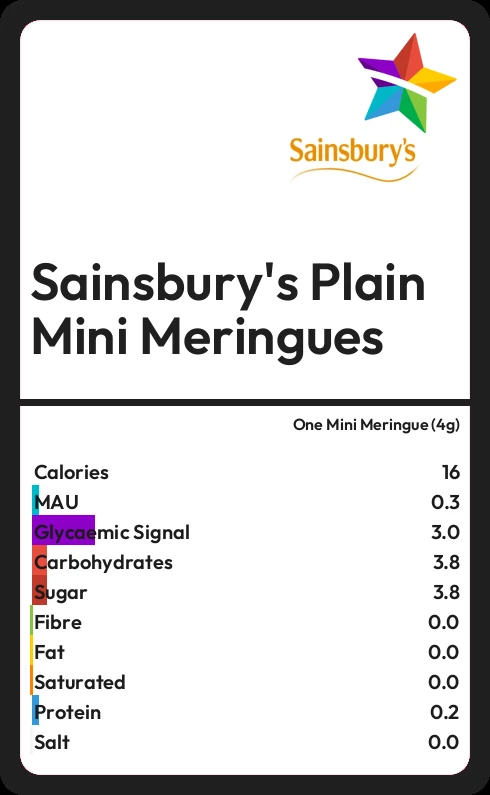 Sainsbury's Plain Mini Meringues contains 3.8g sugar in one Mini Meringue (4g) - that is around 1 cube of sugar.