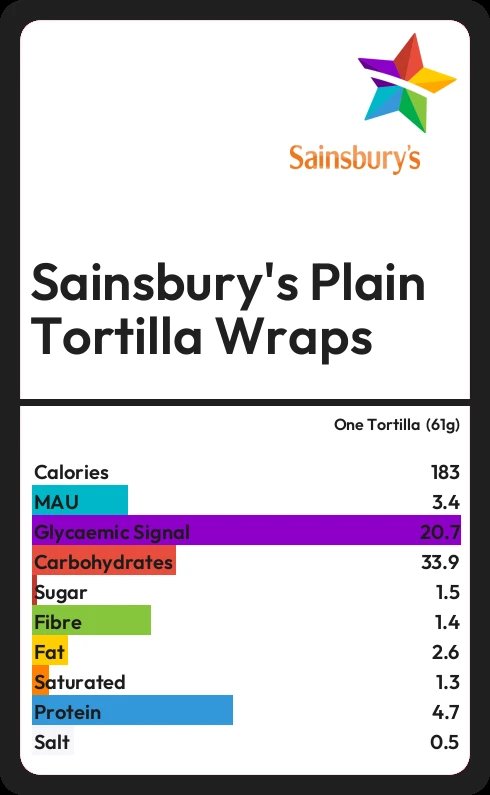 Sainsbury's Plain Tortilla Wraps contains 183 calories in one Tortilla  (61g).