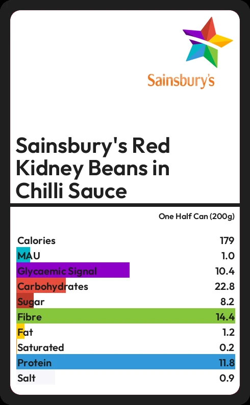 Sainsbury's Red Kidney Beans in Chilli Sauce contains 178 calories in one Half Can (200g).