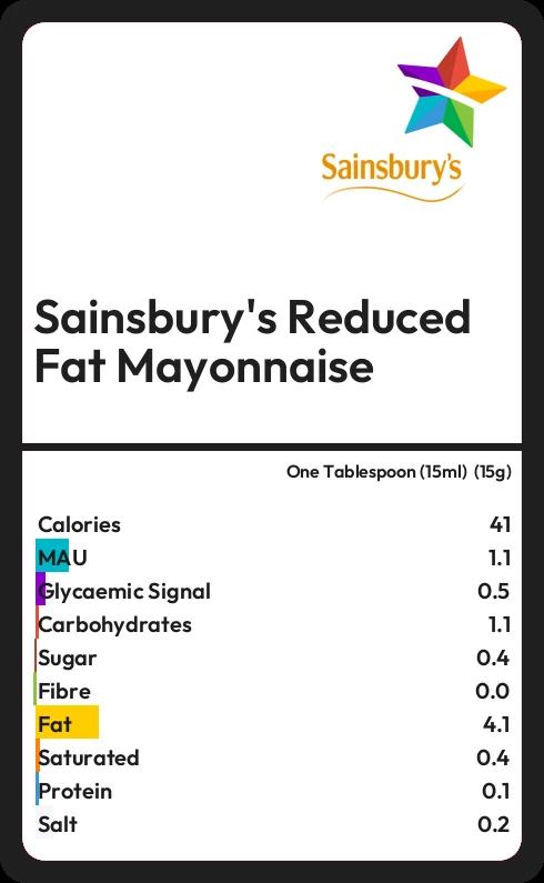Sainsbury's Reduced Fat Mayonnaise contains 41.3 calories in one Tablespoon (15ml) (15g).
