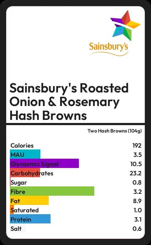 Sainsbury's Roasted Onion & Rosemary Hash Browns contains 0.8g sugar in two Hash Browns (104g)