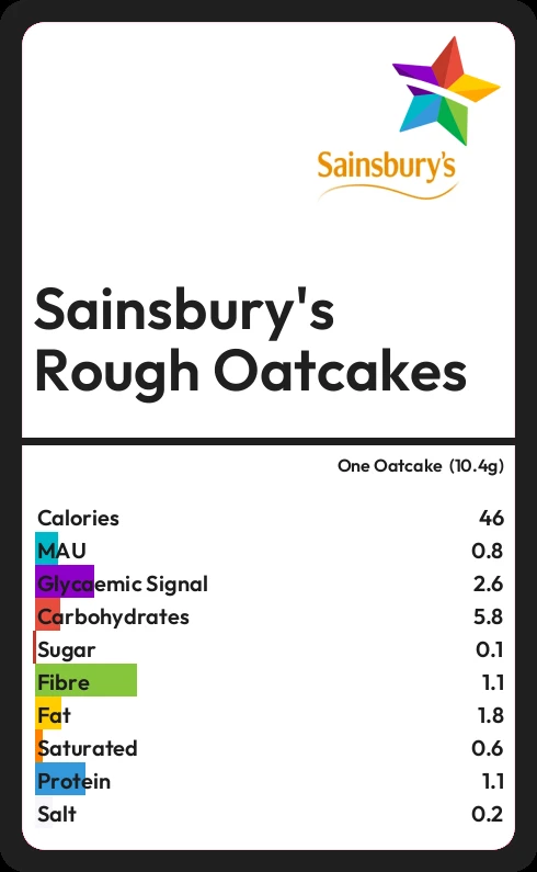 Sainsbury's Rough Oatcakes contains 46.4 calories in one Oatcake  (10.4g).
