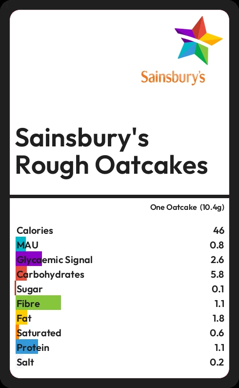 Sainsbury's Rough Oatcakes contains 46.4 calories in one Oatcake (10.4g).