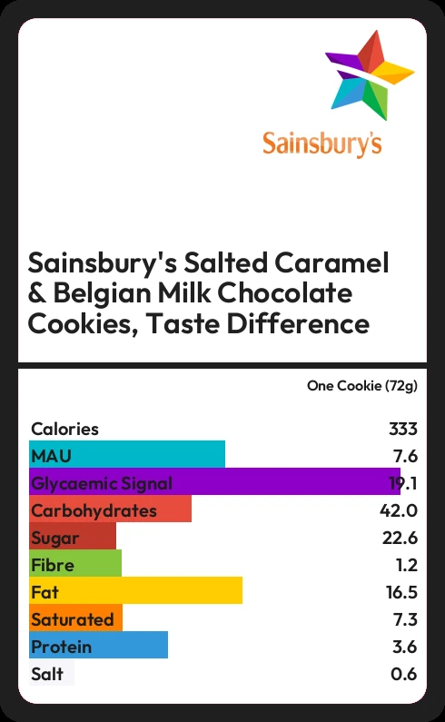 Sainsbury's Salted Caramel & Belgian Milk Chocolate Cookies, Taste Difference contains 332.6 calories in one Cookie (72g).