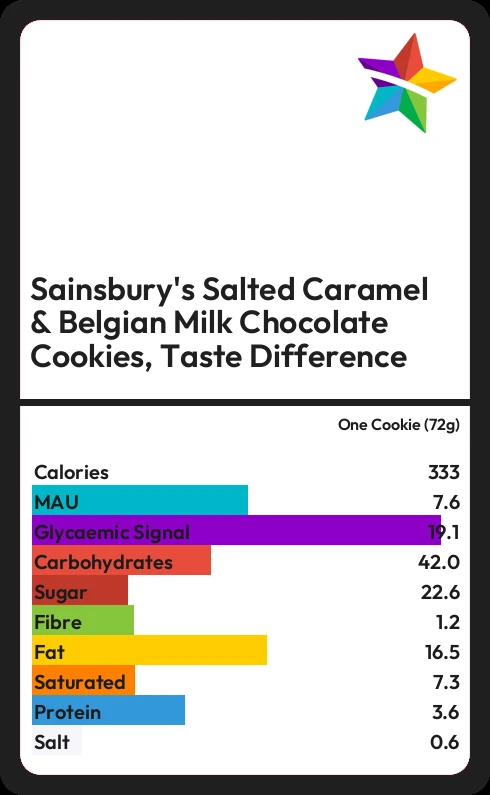 Sainsbury's Salted Caramel & Belgian Milk Chocolate Cookies, Taste Difference contains 332.6 calories in one Cookie (72g).
