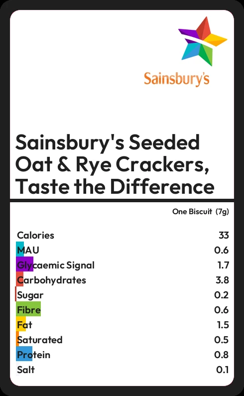 Sainsbury's Seeded Oat & Rye Crackers, Taste the Difference contains 32.7 calories in one Biscuit  (7g).