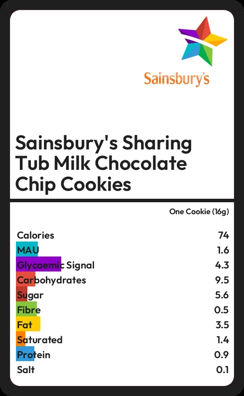 Sainsbury's Sharing Tub Milk Chocolate Chip Cookies contains 5.6g sugar in one Cookie (16g) - that is around 1 cube of sugar.