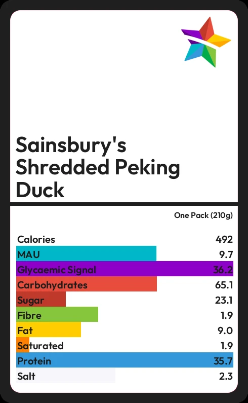 Sainsbury's Shredded Peking Duck contains 23.1g sugar in one Pack (210g) - that is around 6 cubes of sugar.