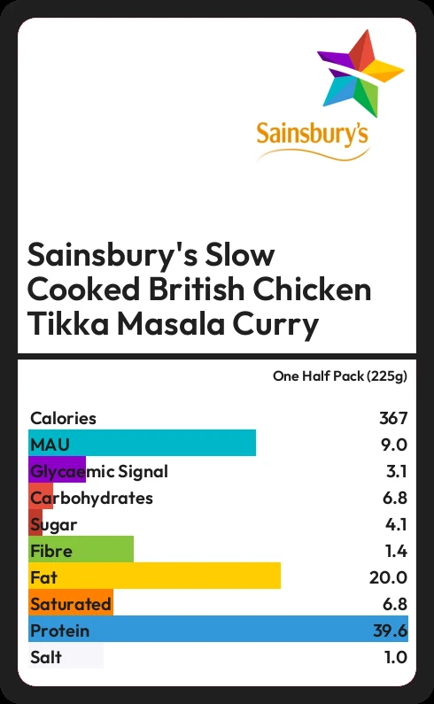 Sainsbury's Slow Cooked British Chicken Tikka Masala Curry contains 366.8 calories in one Half Pack (225g).