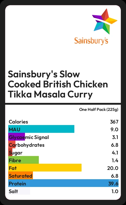 Sainsbury's Slow Cooked British Chicken Tikka Masala Curry contains 366.8 calories in one Half Pack (225g).