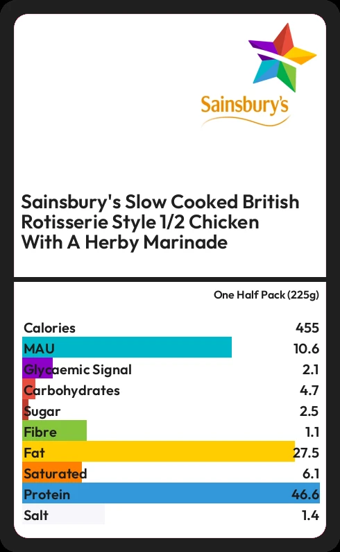 Sainsbury's Slow Cooked British Rotisserie Style 1/2 Chicken With A Herby Marinade contains 454.5 calories in one Half Pack (225g).