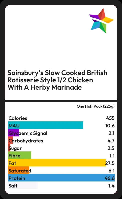Sainsbury's Slow Cooked British Rotisserie Style 1/2 Chicken With A Herby Marinade contains 454.5 calories in one Half Pack (225g).