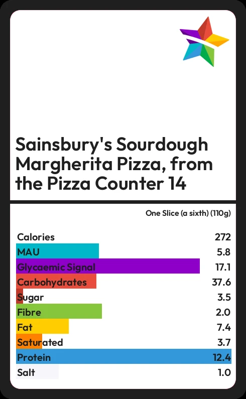 Sainsbury's Sourdough Margherita Pizza, from the Pizza Counter 14 contains 271.7 calories in one Slice (a sixth) (110g).