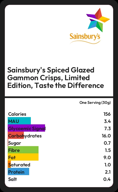 Sainsbury's Spiced Glazed Gammon Crisps, Limited Edition, Taste the Difference contains 155.7 calories in one Serving (30g).