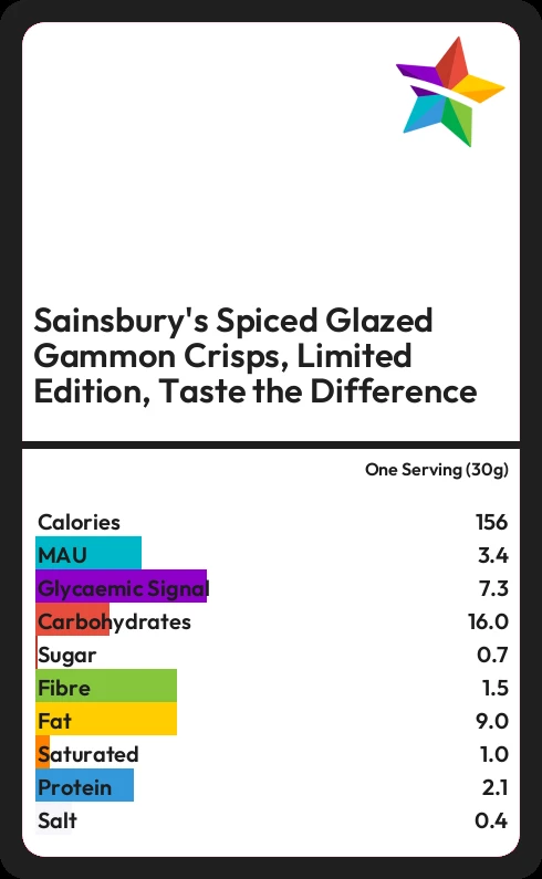 Sainsbury's Spiced Glazed Gammon Crisps, Limited Edition, Taste the Difference contains 155.7 calories in one Serving (30g).