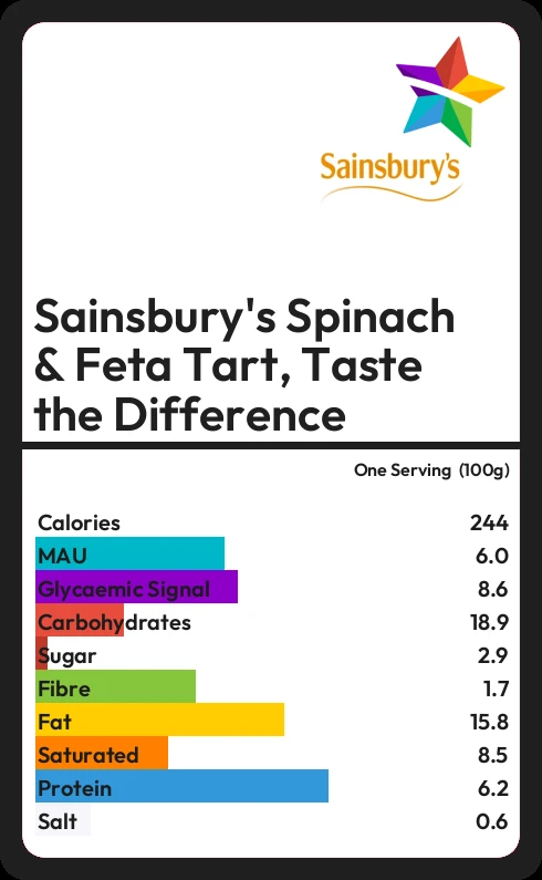 Sainsbury's Spinach & Feta Tart, Taste the Difference contains 2.9g sugar in one Serving (100g) - that is around 1 cube of sugar.