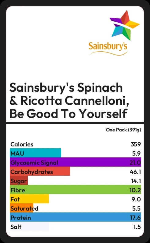 Sainsbury's Spinach & Ricotta Cannelloni, Be Good To Yourself contains 14.1g sugar in one Pack (391g) - that is around 4 cubes of sugar.