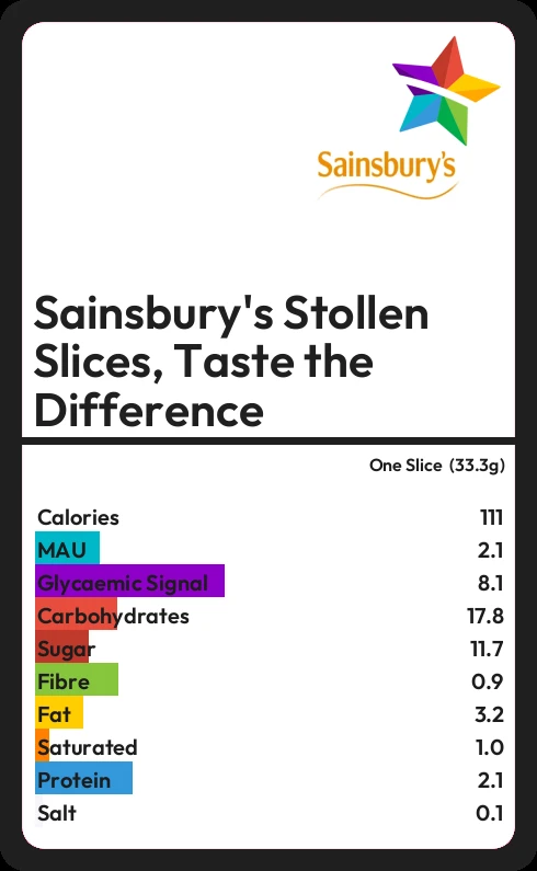 Sainsbury's Stollen Slices, Taste the Difference contains 110.9 calories in one Slice (33.3g).
