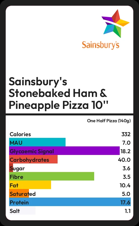 Sainsbury's Stonebaked Ham & Pineapple Pizza 10'' contains 331.8 calories in one Half Pizza (140g).