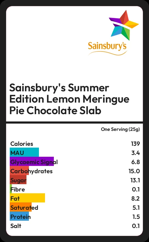 Sainsbury's Summer Edition Lemon Meringue Pie Chocolate Slab contains 13.1g sugar in one Serving (25g) - that is around 3 cubes of sugar.