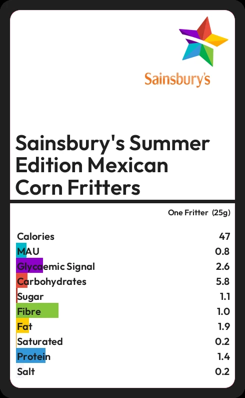 Sainsbury's Summer Edition Mexican Corn Fritters contains 1.1g sugar in one Fritter (25g)