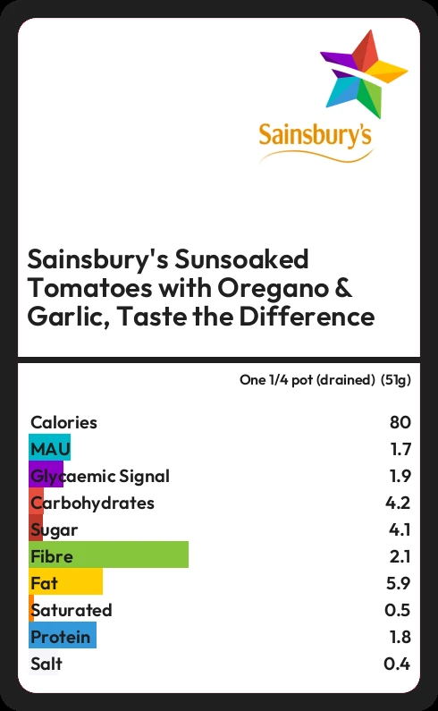 Sainsbury's Sunsoaked Tomatoes with Oregano & Garlic, Taste the Difference contains 80.1 calories in one 1/4 pot (drained) (51g).