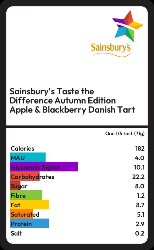 Sainsbury's Taste the Difference Autumn Edition Apple & Blackberry Danish Tart contains 181.8 calories in one 1/6 tart (71g).