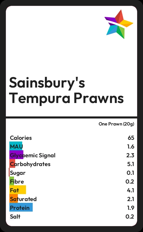 Sainsbury's Tempura Prawns contains 65 calories in one Prawn (20g).