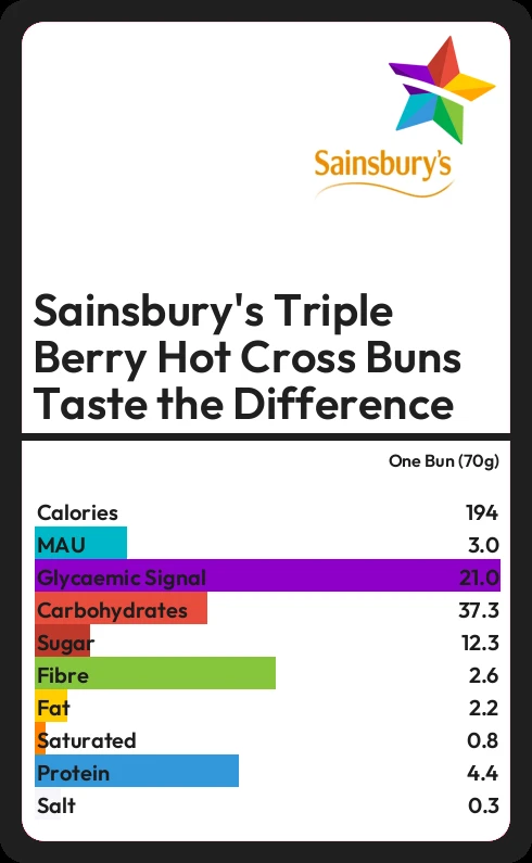 Sainsbury's Triple Berry Hot Cross Buns Taste the Difference contains 12.3g sugar in one Bun (70g) - that is around 3 cubes of sugar.