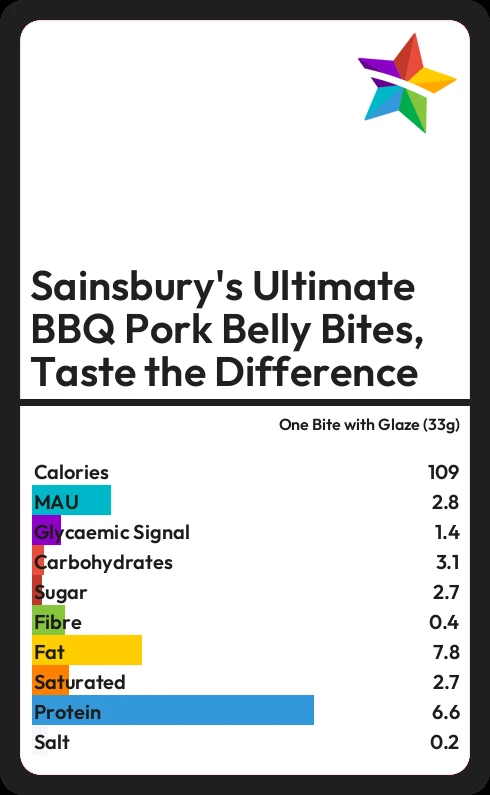 Sainsbury's Ultimate BBQ Pork Belly Bites, Taste the Difference contains 109.6 calories in one Bite with Glaze (33g).