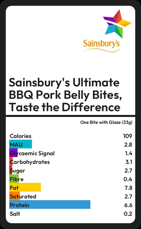Sainsbury's Ultimate BBQ Pork Belly Bites, Taste the Difference contains 2.7g sugar in one Bite with Glaze (33g) - that is around 1 cube of sugar.