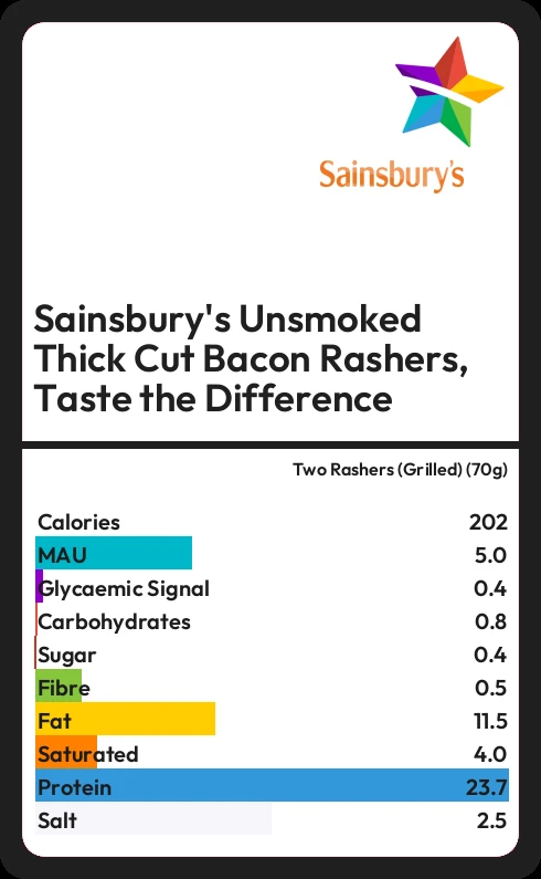Sainsbury's Unsmoked Thick Cut Bacon Rashers, Taste the Difference contains 201.6 calories in two Rashers (Grilled) (70g).