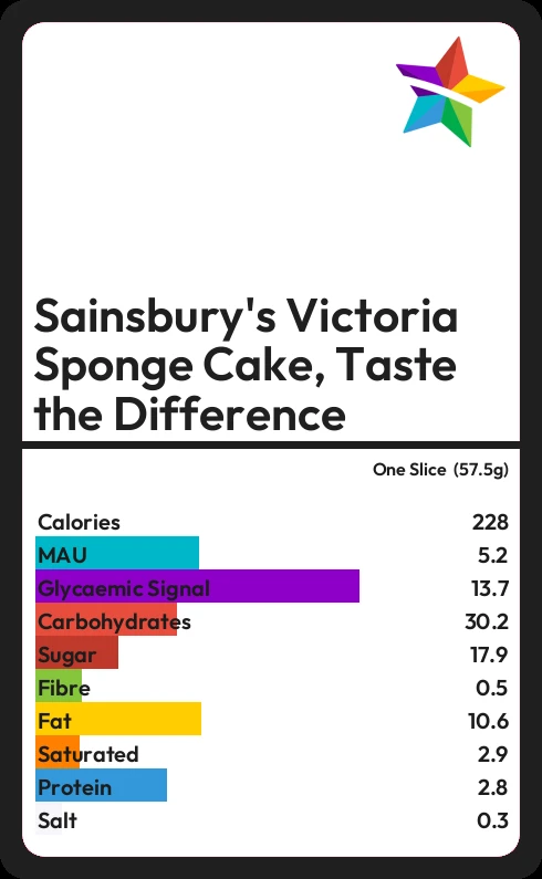 Sainsbury's Victoria Sponge Cake, Taste the Difference contains 17.9g sugar in one Slice (57.5g) - that is around 4 cubes of sugar.