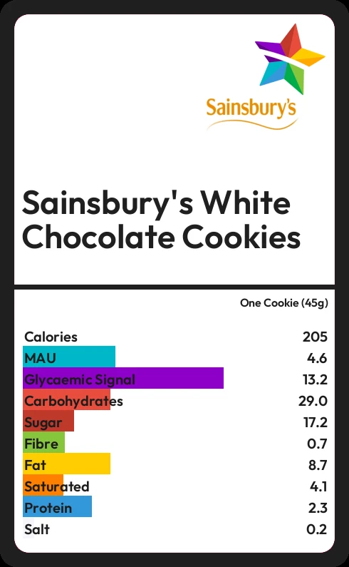 Sainsbury's White Chocolate Cookies contains 17.2g sugar in one Cookie (45g) - that is around 4 cubes of sugar.