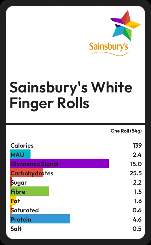 Sainsbury's White Finger Rolls contains 139.3 calories in one Roll (54g).