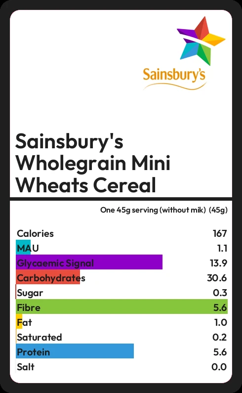 Sainsbury's Wholegrain Mini Wheats Cereal contains 0.3g sugar in one 45g serving (without mik) (45g)