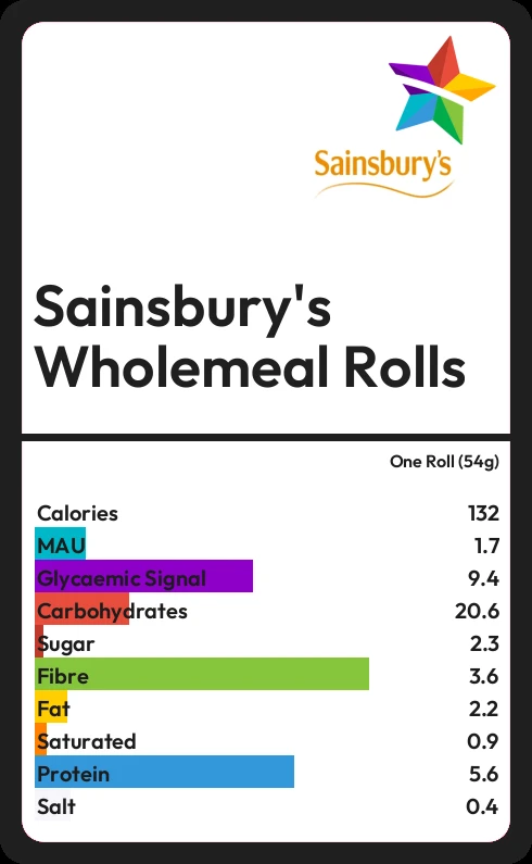 Sainsbury's Wholemeal Rolls contains 132.3 calories in one Roll (54g).