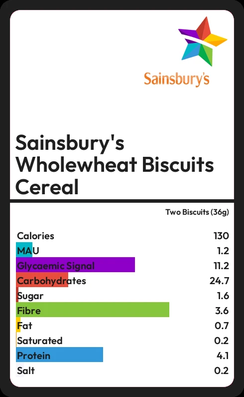 Sainsbury's Wholewheat Biscuits Cereal contains 130.3 calories in two Biscuits (36g).
