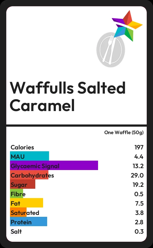 Waffulls Salted Caramel contains 19.2g sugar in one Waffle (50g) - that is around 5 cubes of sugar.