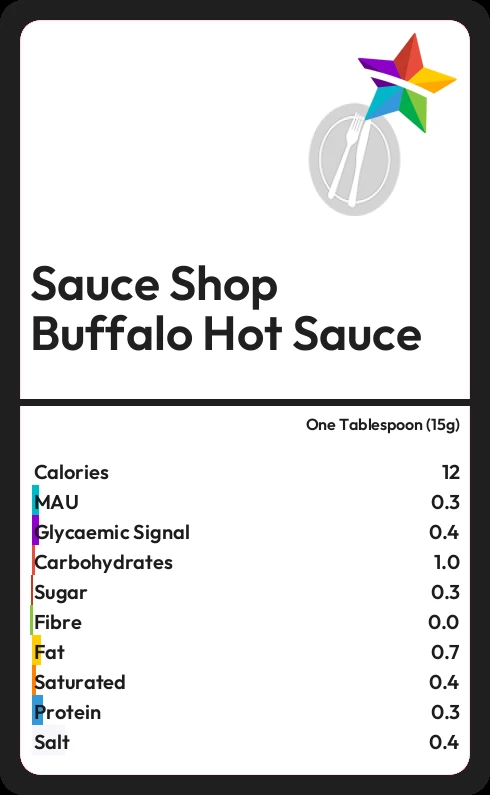 Sauce Shop Buffalo Hot Sauce contains 0.3g sugar in one Tablespoon (15g)