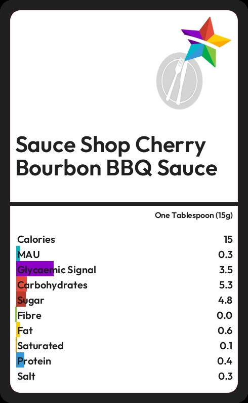 Sauce Shop Cherry Bourbon BBQ Sauce contains 4.8g sugar in one Tablespoon (15g) - that is around 1 cube of sugar.