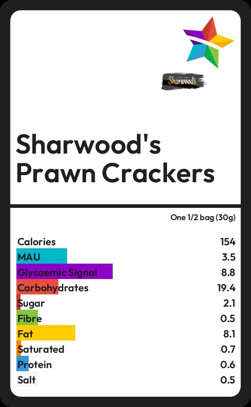 Sharwood's Prawn Crackers contains 153.9 calories in one 1/2 bag (30g).