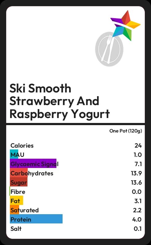 Ski Smooth Strawberry And Raspberry Yogurt contains 13.6g sugar in one Pot (120g) - that is around 3 cubes of sugar.