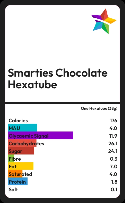 Smarties Chocolate Hexatube contains 24.1g sugar in one Hexatube (38g) - that is around 6 cubes of sugar.