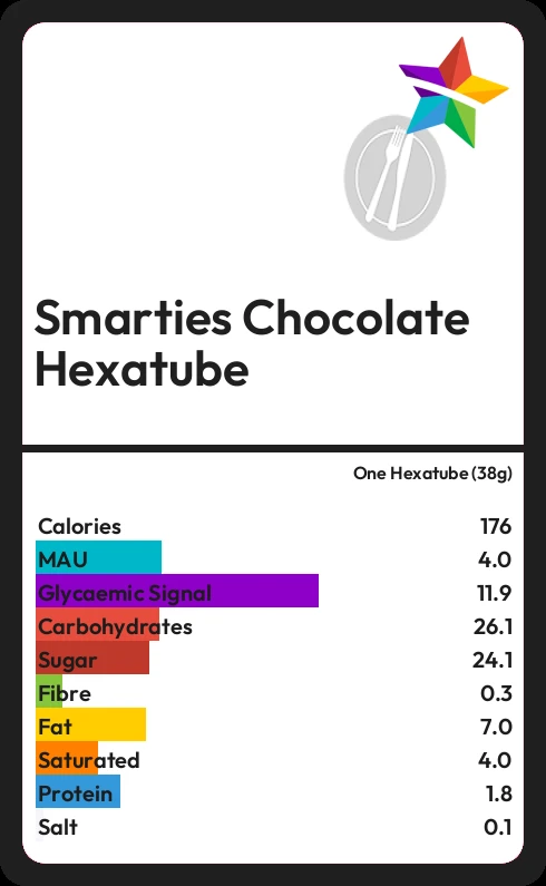 Smarties Chocolate Hexatube contains 24.1g sugar in one Hexatube (38g) - that is around 6 cubes of sugar.